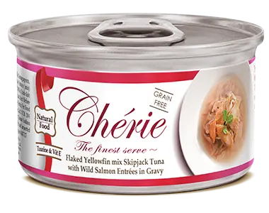 To luksusowa mieszanka płatków tuńczyka żółtopłetwego z dzikim łososiem, aby wzbogacić różnorodność smaków owoców morza bogatym sosem w kuszącej i apetycznej przystawce dla Twoich uroczych kotów. Dzięki naturalnym smakom i sosowi charakterystycznemu dla Chérie, jest to luksusowe doznanie smakowe dla kotów. Każdy przepis zawiera delikatne kawałki świeżych owoców morza w pysznym sosie.