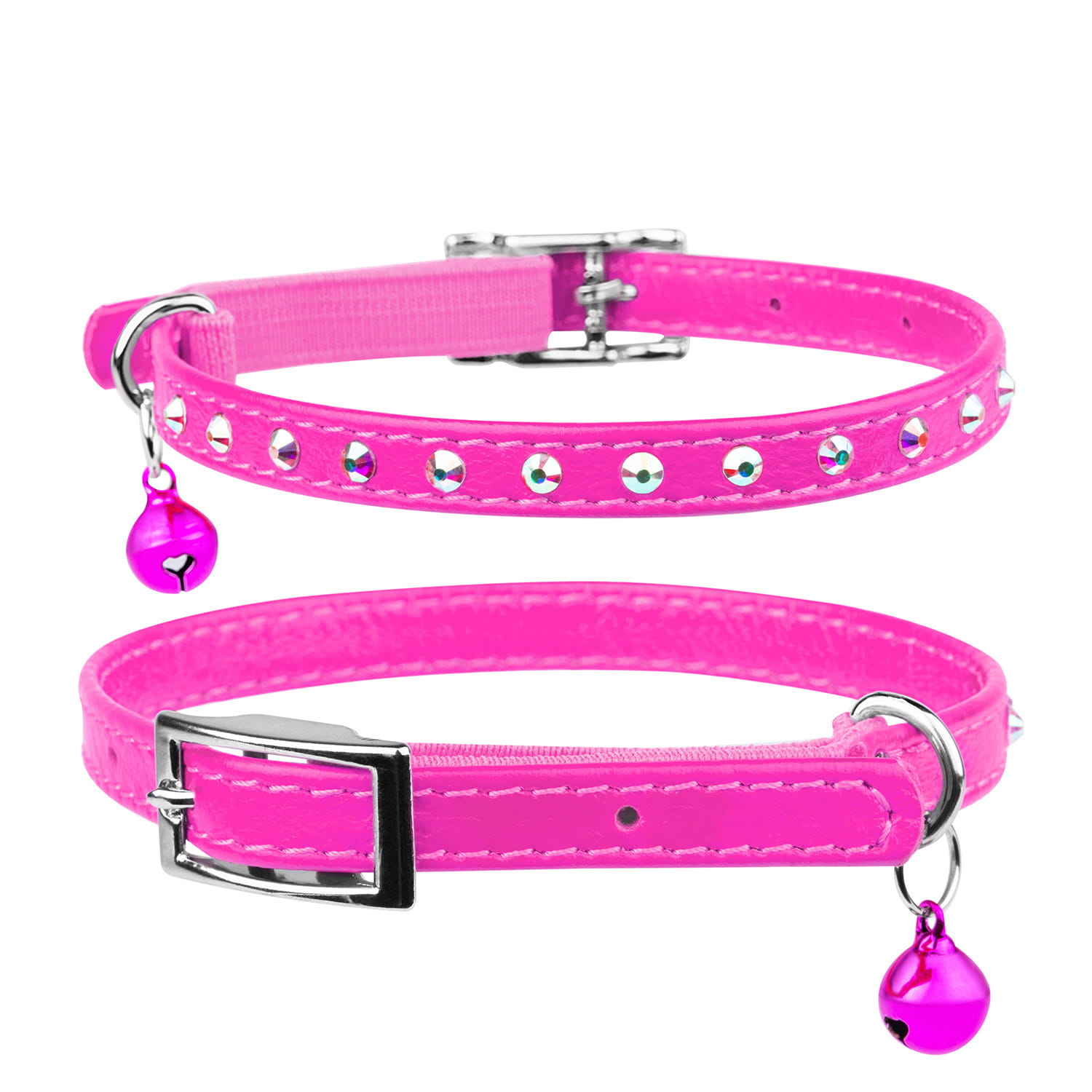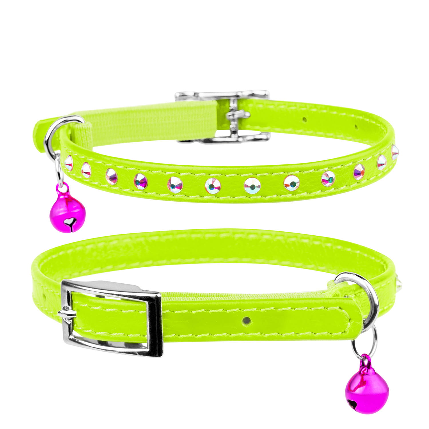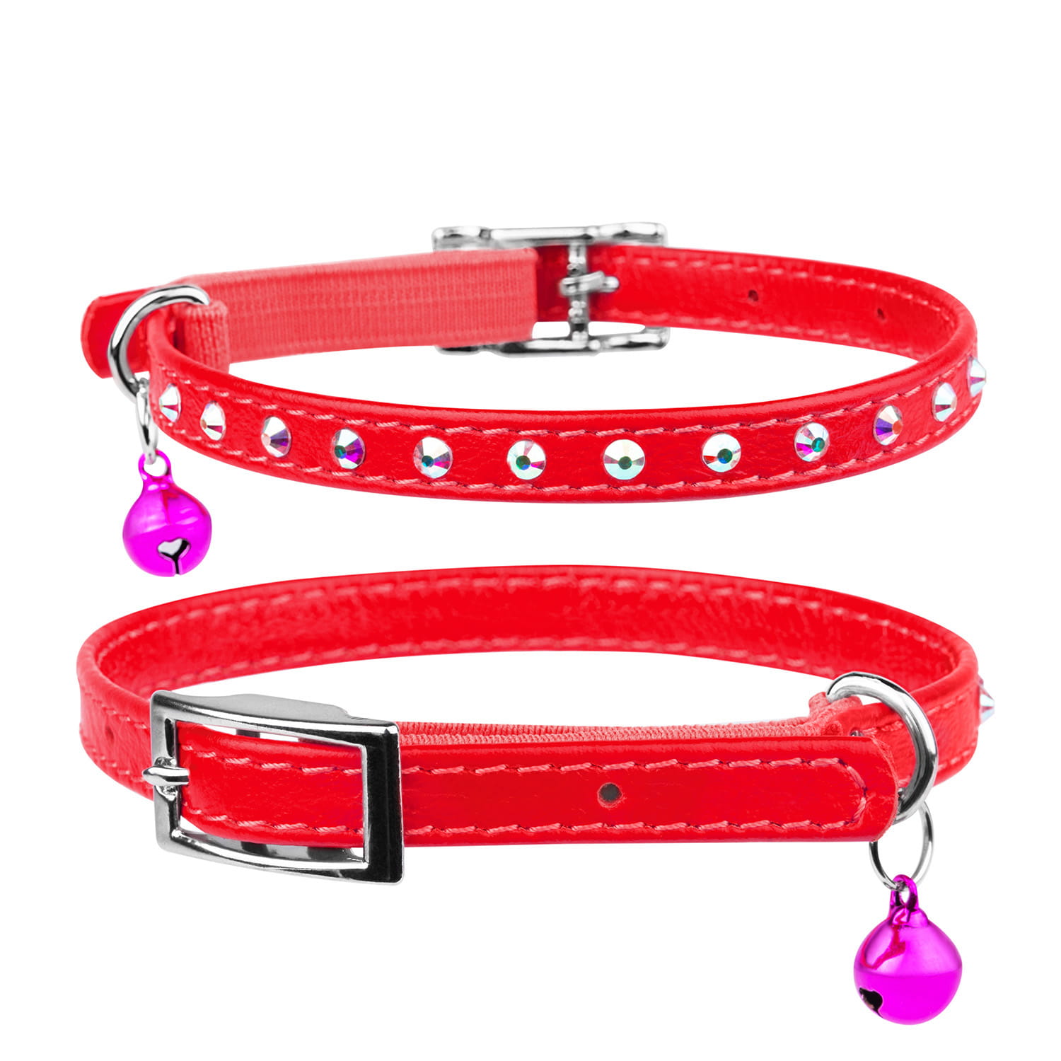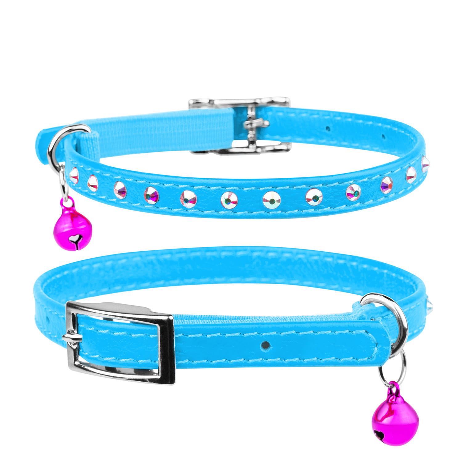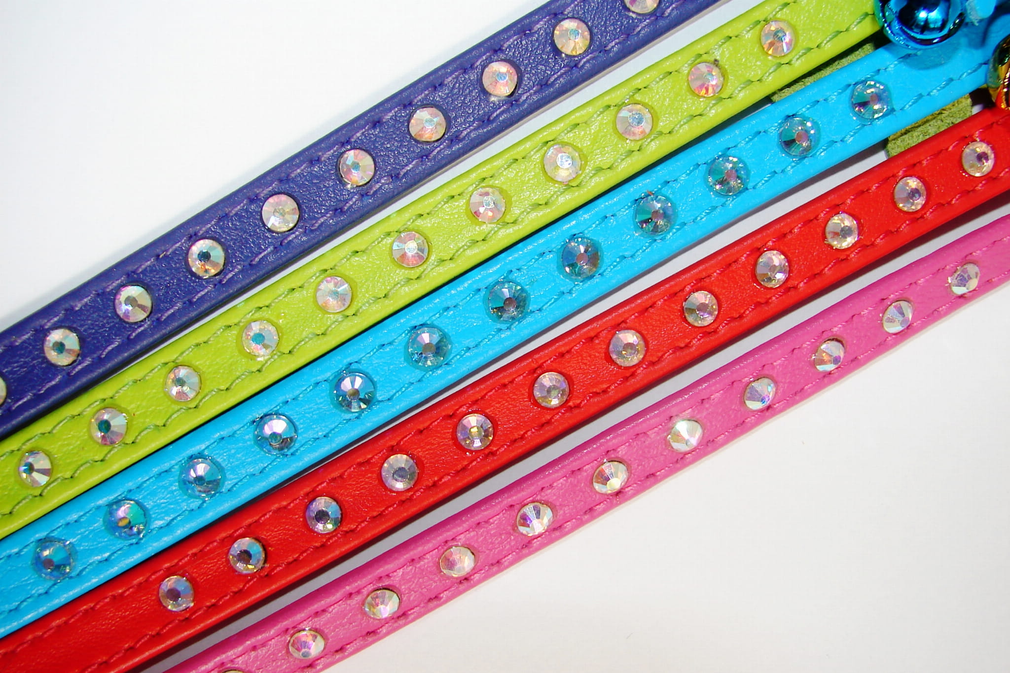 CoLLaR Glamour to linia obroży i smyczy ze skóry,obustronnie wykończona skórą licową, szytą (i klejoną) , barwioną w pięknych, żywych i pastelowych kolorach, z elementami ozdobnymi - 12 jasnymi kryształami górskimi - piękny efekt wizualny. Klamerka do paska skórzanego mocowana jest za pomocą taśmy elastycznej w tym samym kolorze, co daje duży stopień bezpieczeństwa i komfortu Waszemu kotu.