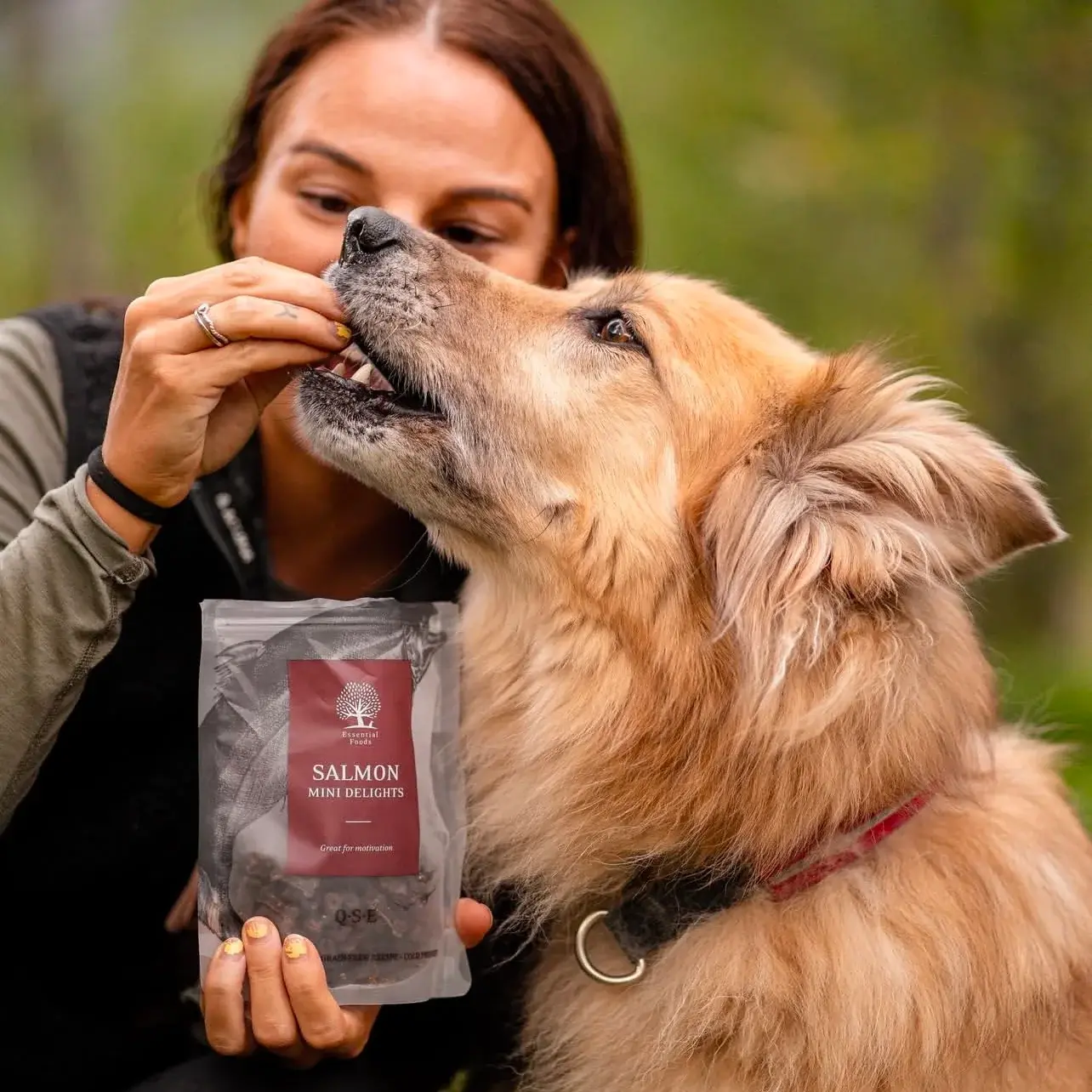 Essential - Salmon Mini Delights to naturalne, bez zbóż, wspaniałe do treningu, na nagrody, przekąski z 70% zawartością łososia (70%). To, miękkie , drobne krokieciki. Dla każdej rasy, jednak wielkość odpowiednia też dla ras małych Formuła zgodna z BOF (behawioralnej optymalizacji karmy )