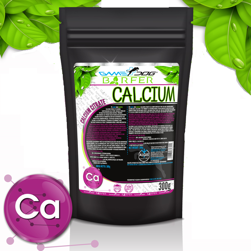 GameDog BARFER Calcium Citrate to karma uzupełniająca dla psów, będąca źródłem wysoko przyswajalnego wapnia. Produkt dedykowany jest przede wszystkim do bilansowania poziomu wapnia w domowych dietach gotowanych lub opartych na surowym mięsie. Cytrynian wapnia nie zawiera fosforu, dlatego doskonale sprawdza się również jako suplement wapnia dla psów z chorobami nerek i dróg moczowych.