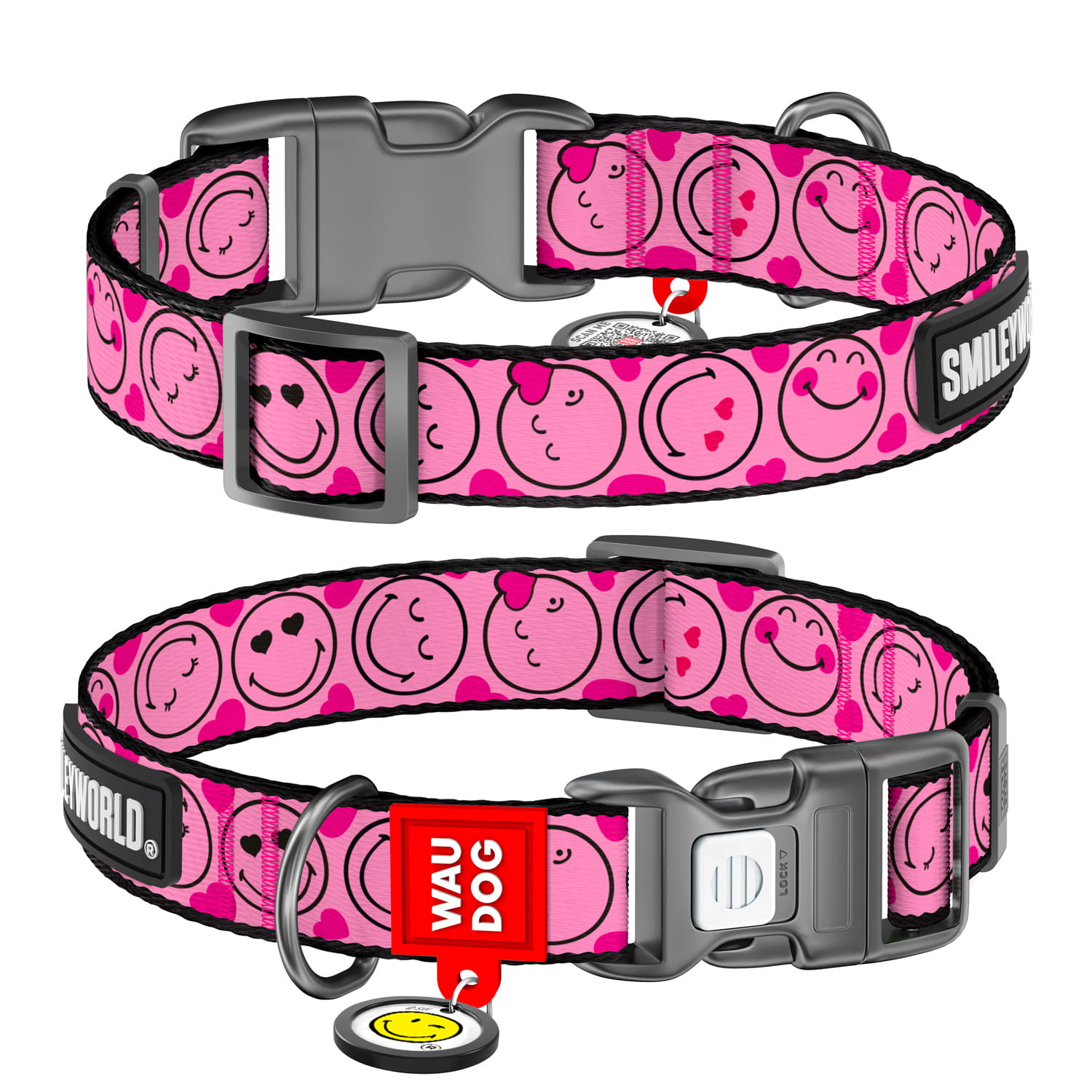 Obroża dla psa SmileyWorld® dostępna w 4 rozmiarach - wzór "Pink Smileys" z klamrą plastikową z zamkiem (zamek kumulujący światło).
