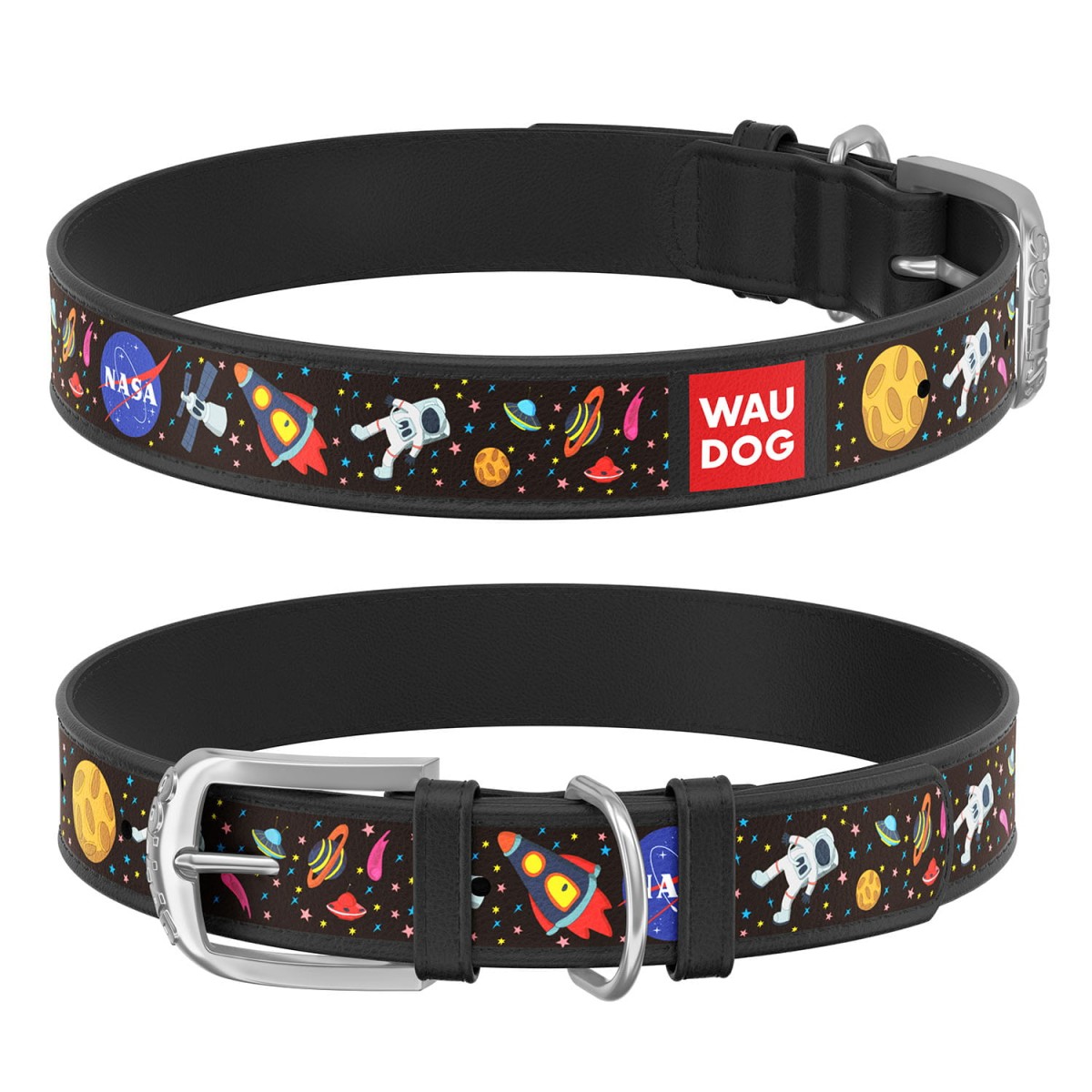 Obroża skórzana z motywem i logo "NASA" - odporny, innowacyjny druk odporny na warunki atmosferyczne.