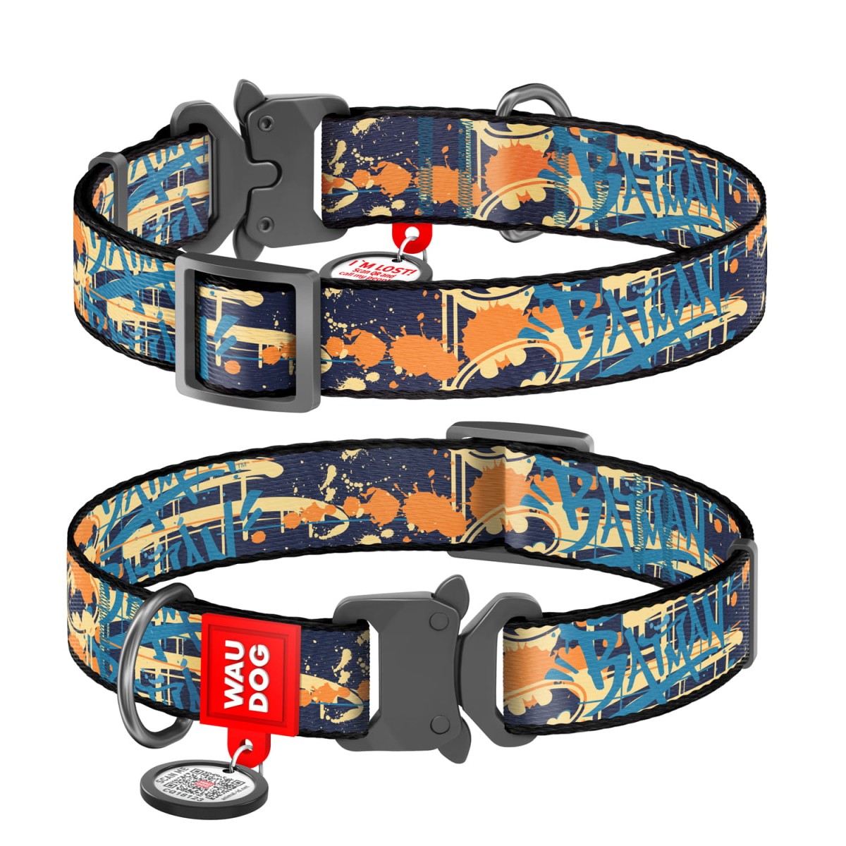 WauDog NYLON -DC "Batman Jeans" - to wyjątkowo wytrzymała , designerska obroża w 4 wymiarach z klamrą metalową typu "cobra" uniemożliwiającym samoistne wypięcie.