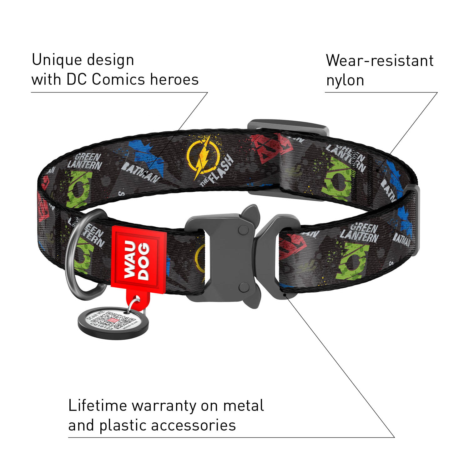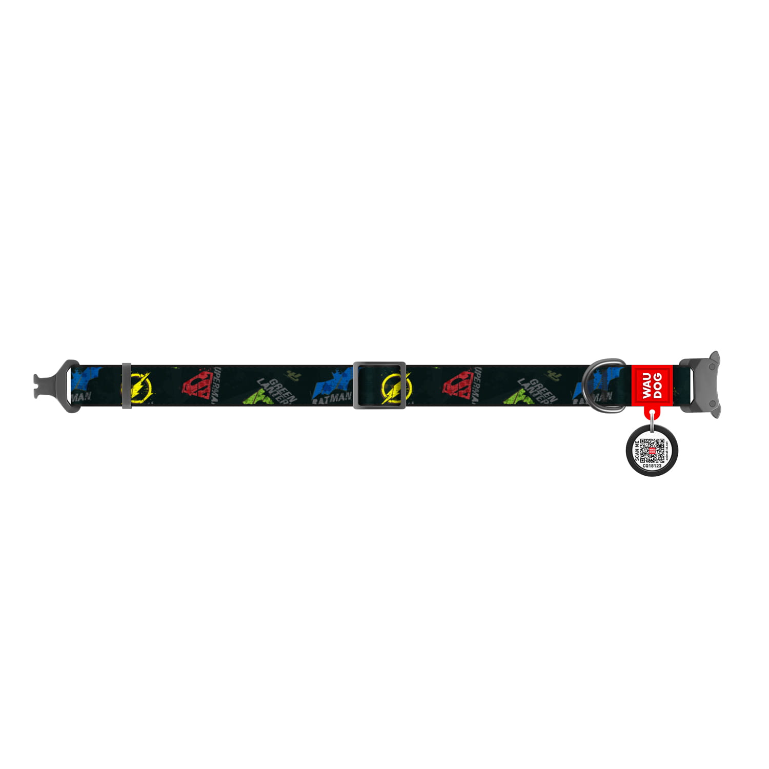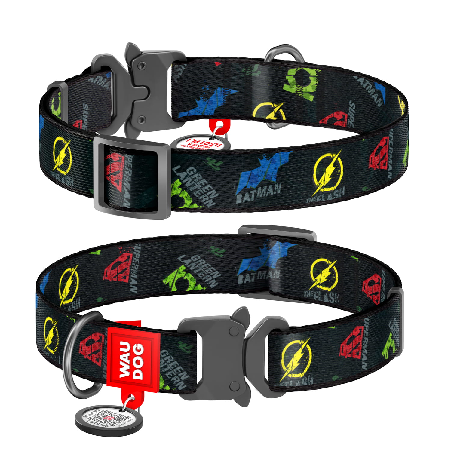 WauDog NYLON -DC "Justice League" - to wyjątkowo wytrzymała , designerska obroża w 4 wymiarach z klamrą metalową typu "cobra" uniemożliwiającym samoistne wypięcie.
