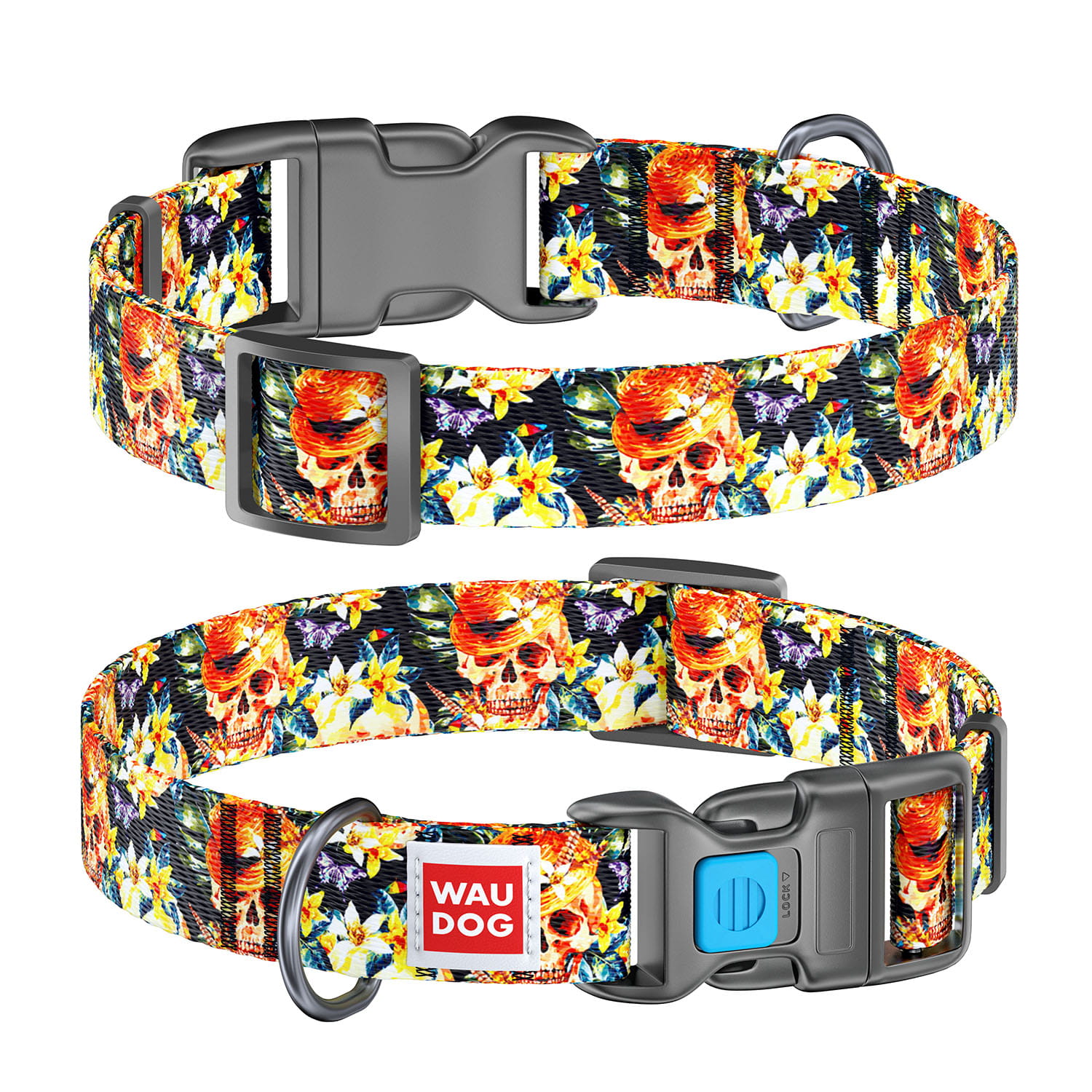 WauDog NYLON - obroża "Glamorous Skulls" + Smart ID