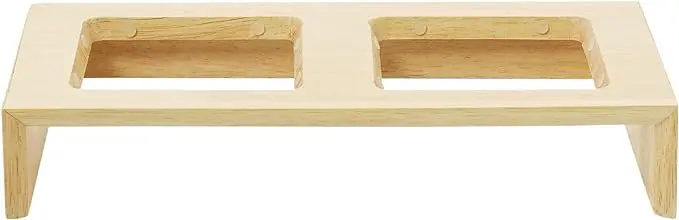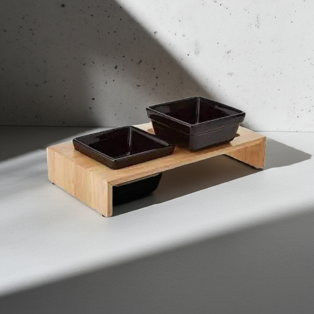 Miski ceramiczne są trwałe i łatwe w utrzymaniu w czystości. Drewniana podstawa (drewno kauczukowca) jest stabilna i estetyczna. Silikonowe gumki zapewniają pewne mocowanie misek, a antypoślizgowe nóżki zapobiegają przesuwaniu się zestawu.